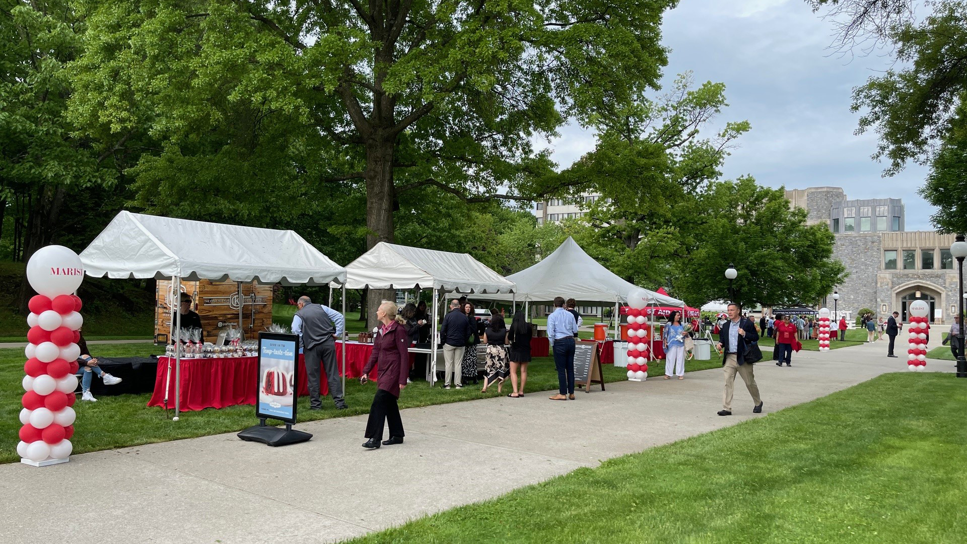 For guests using wheelchairs, red-banded chairs can be removed to accommodate their needs. We recommend sitting near the upper section of the Campus Green, closest to the Murray Student Center, where there is a paved walkway for easier access to services such as bathrooms and parking.