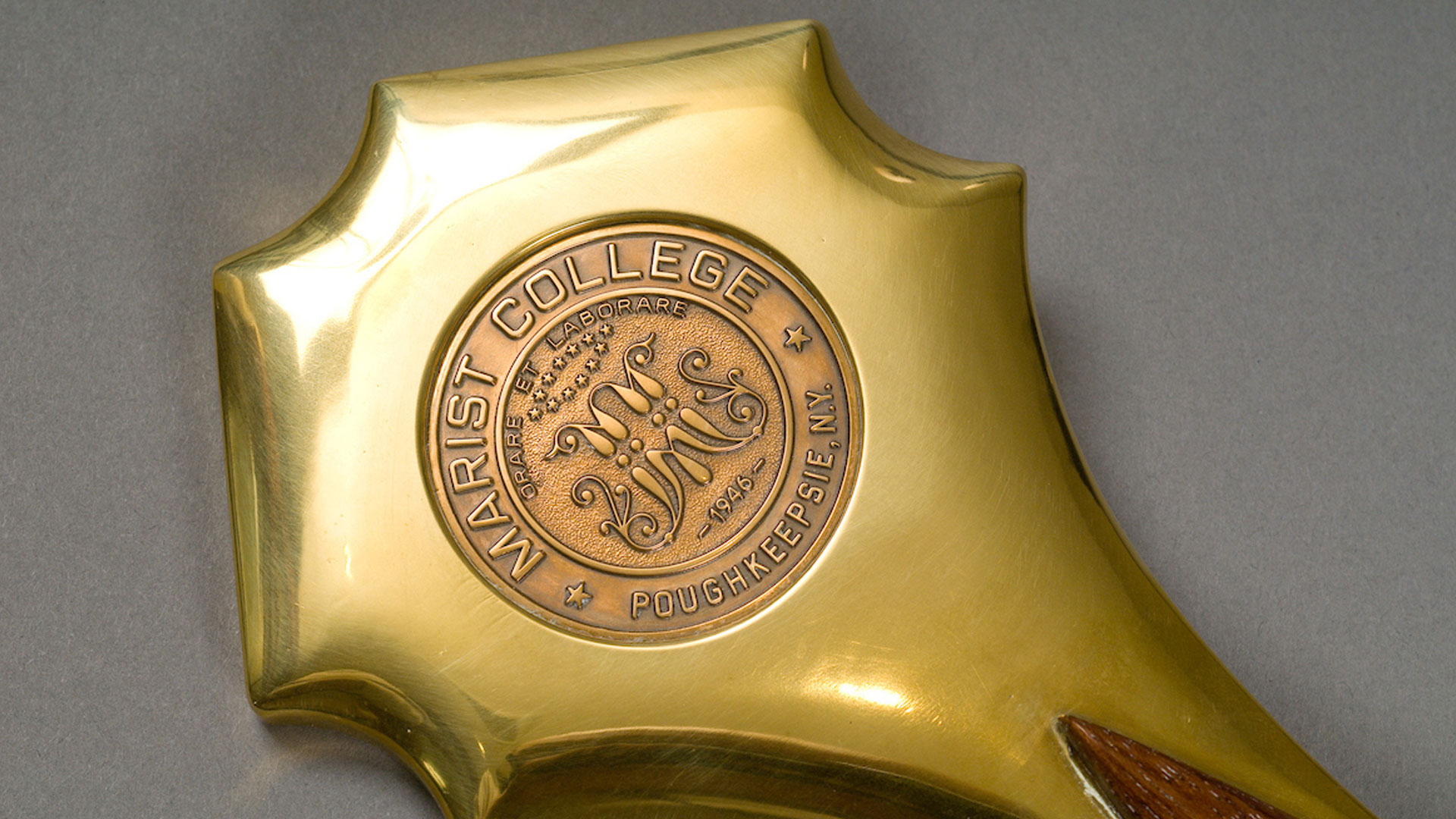 The mace of Marist has the traditional long squared stem reminiscent of both the Roman and medieval maces. It supports a three-sided crown on which is emblazoned the seal. This tripartite crown symbolizes the three goals of Marist: excellence in education, the importance of community, and commitment to service. The seal is composed of two concentric circles on which is engraved "Marist College, Poughkeepsie, N.Y." On the inner section are the interlaced letters A and M with the date 1946 at the foot of the letters and 12 stars above them. The whole is crowned with the motto Orare et Laborare (To Pray and To Work). The letters A and M are the symbols of Mary as are the 12 stars, a reminder of the traditions of the founders of Marist.