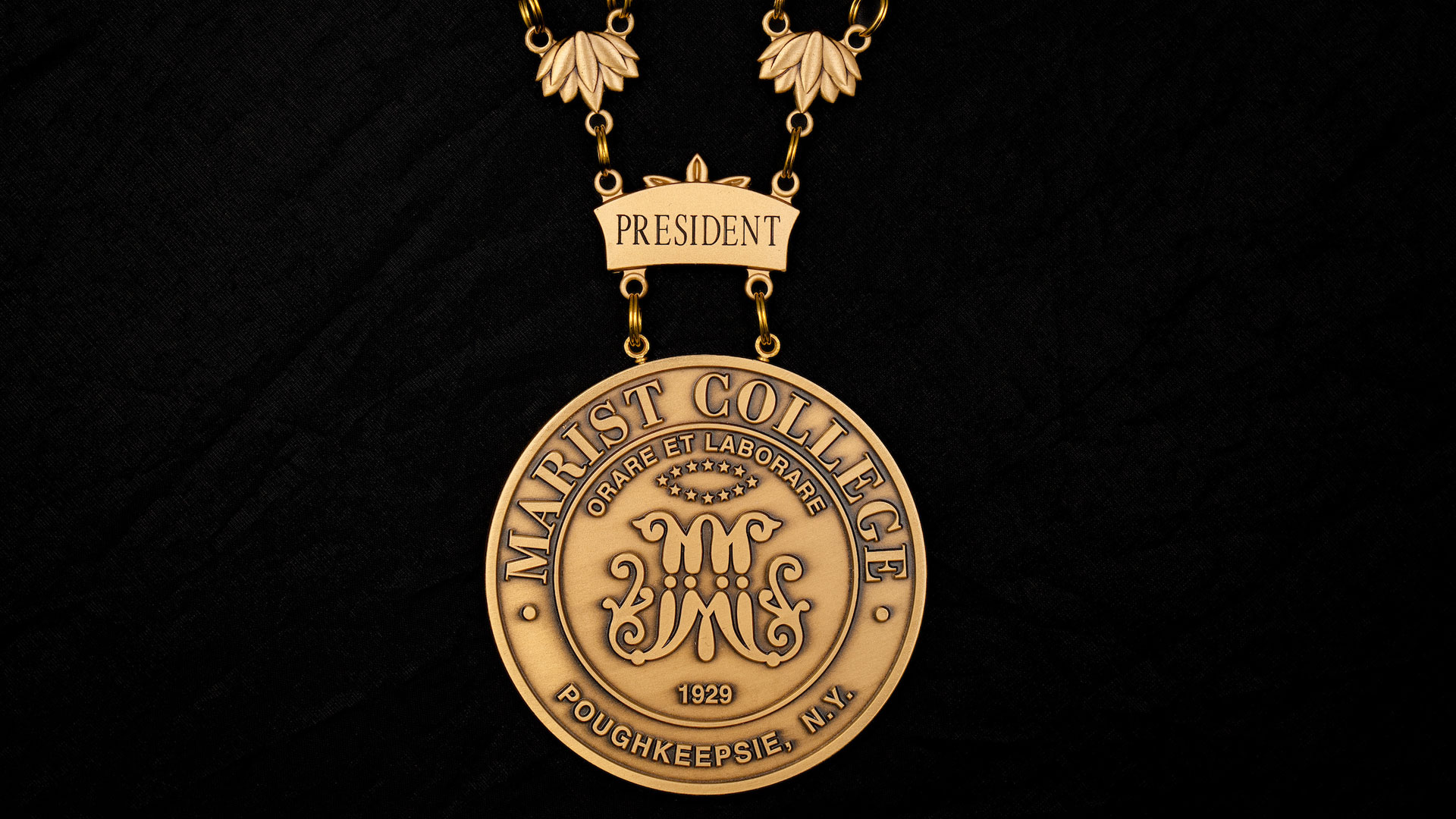 The medallion is worn around the neck of the president. Like the mace and seal, the medallion is a symbol of authority. Its roots may be traced back to the Roman bulla, a golden amulet of honor. The obverse of the medallion shows the seal of the office that the wearer holds—in our case, the seal of Marist—and, not infrequently, the reverse shows the personal seal or coat of arms of the bearer.
