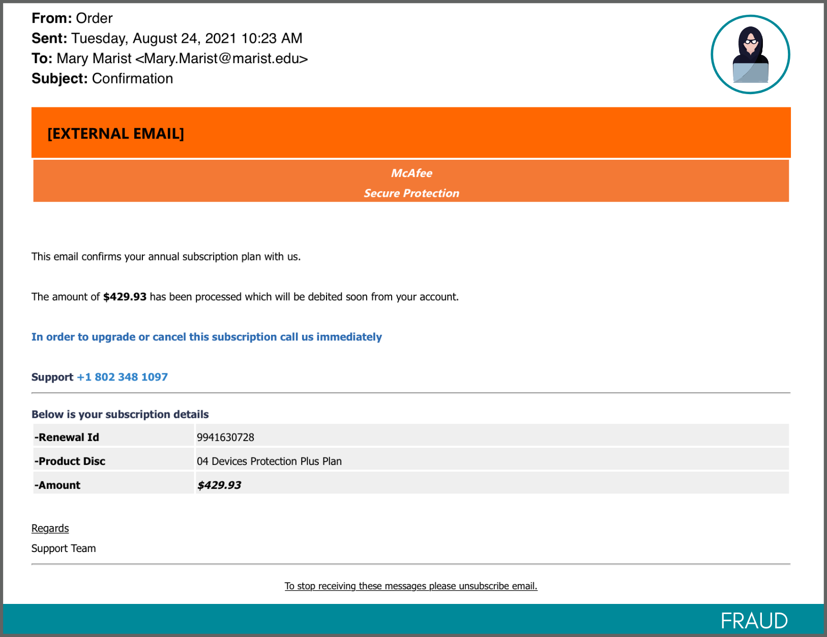 • How does this scam work?  If you call the number in the email, the person on the line will ask you for your bank account or credit card account information, and then make unauthorized purchases using your account