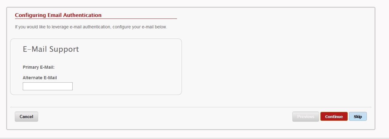 Next you can set up an alternative email address. Again, this is optional but it provides an additional authentication format. You can either type your alternative email address and press Continue or select Skip.