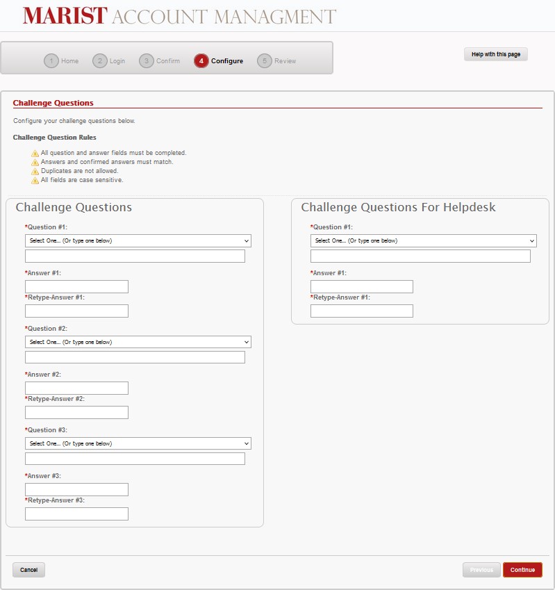 Now you can set up your own personal challenge questions. Each question must be answered twice in an identical manner. You can select any of the pre-create questions or create your own question. You may not use the same question for all three challenge questions. The answers are not case-sensitive. All question and answer fields must be completed before selecting the Continue button. There is also a Challenge Question for the Help Desk in the event you are locked out of your ReACT account.
