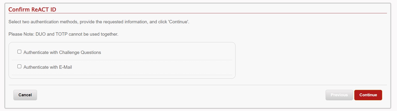 You will then be asked to Confirm your ReACT ID. You will need to select both authentication methods, Authenticate with Challenge Questions and Authenticate with E-Mail. These should be completed one at a time.