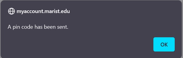 You need to click on OK to remove the pop-up box. A pin code should arrive within a few minutes to your email. Make sure to check any Spam or Junk folders as well. If it does not, you can try again. If you are still unable to receive the pin code in your email, please reach out to the Help Desk (845-575-4357 or HelpDesk@marist.edu). Please note that the pin code is only available for a short period of time. If you run into an error, request a new pin code.