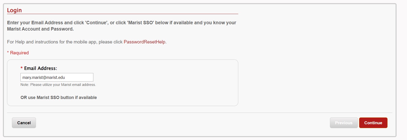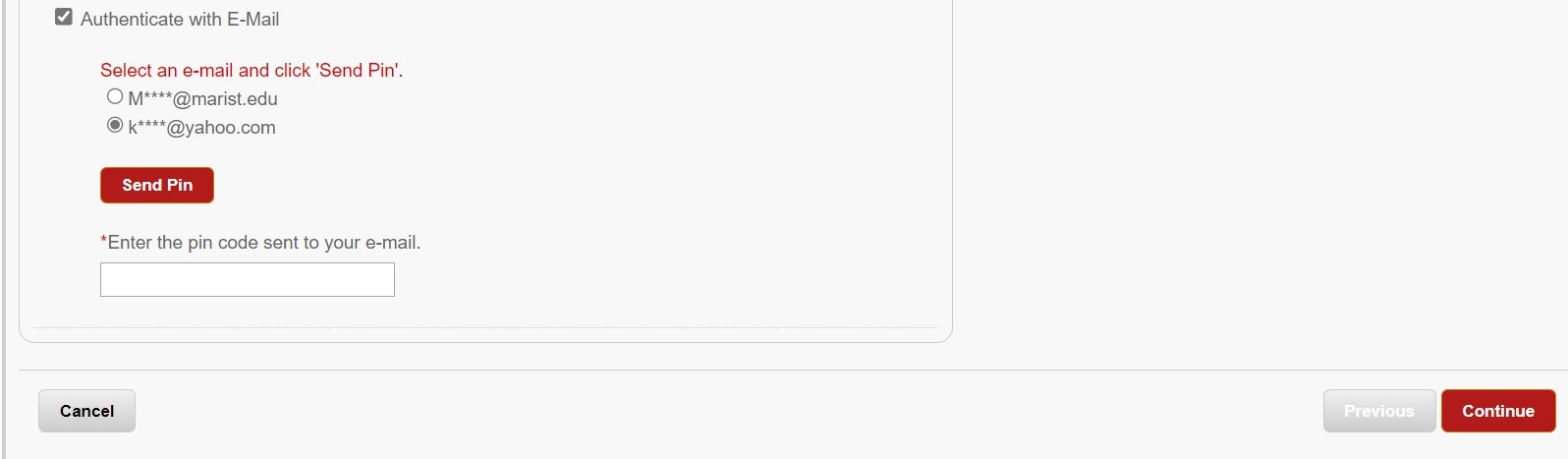 Authenticate with E-Mail will provide the email address used when you applied to Marist. It will have an empty box under the E-mail address to enter a pin in.