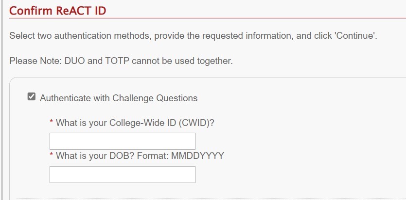 Authenticate with Challenge Questions will ask for your Campus Wide ID (CWID) and date of birth (DOB). Your CWID will have been provided in your acceptance package.