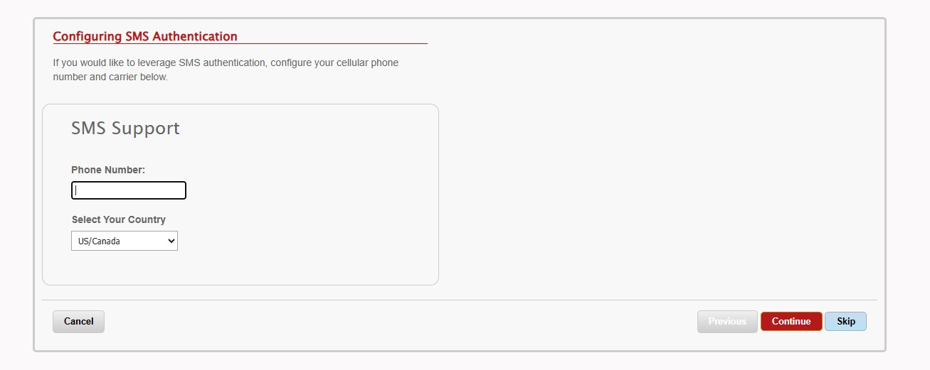 Another option is setting up SMS (text) authentication by adding your mobile number. Press Continue once you have entered this information. you may also Skip this step if you do not wish to use SMS as an authentication method.