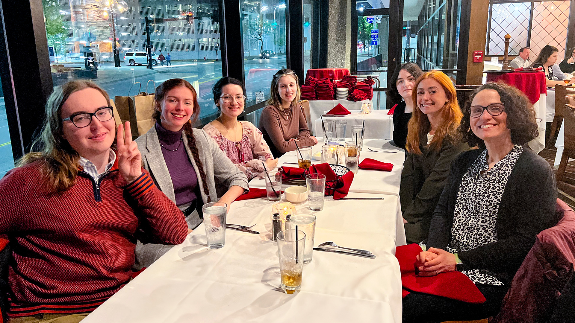 Image of Patty Tarantello at a restaurant with students.