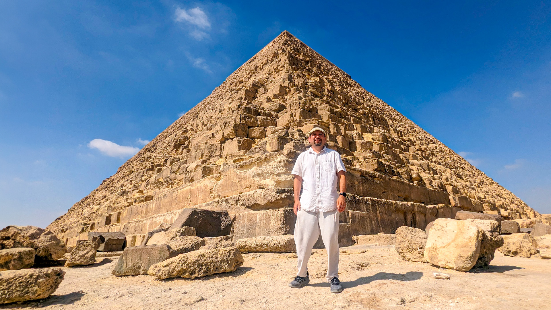 Image of Tony Carrizales receiving award. Image of Tony Carrizales standing in front of one of the great pyramids.